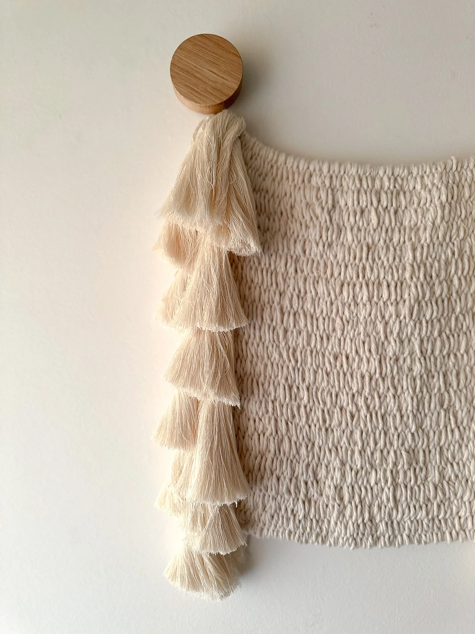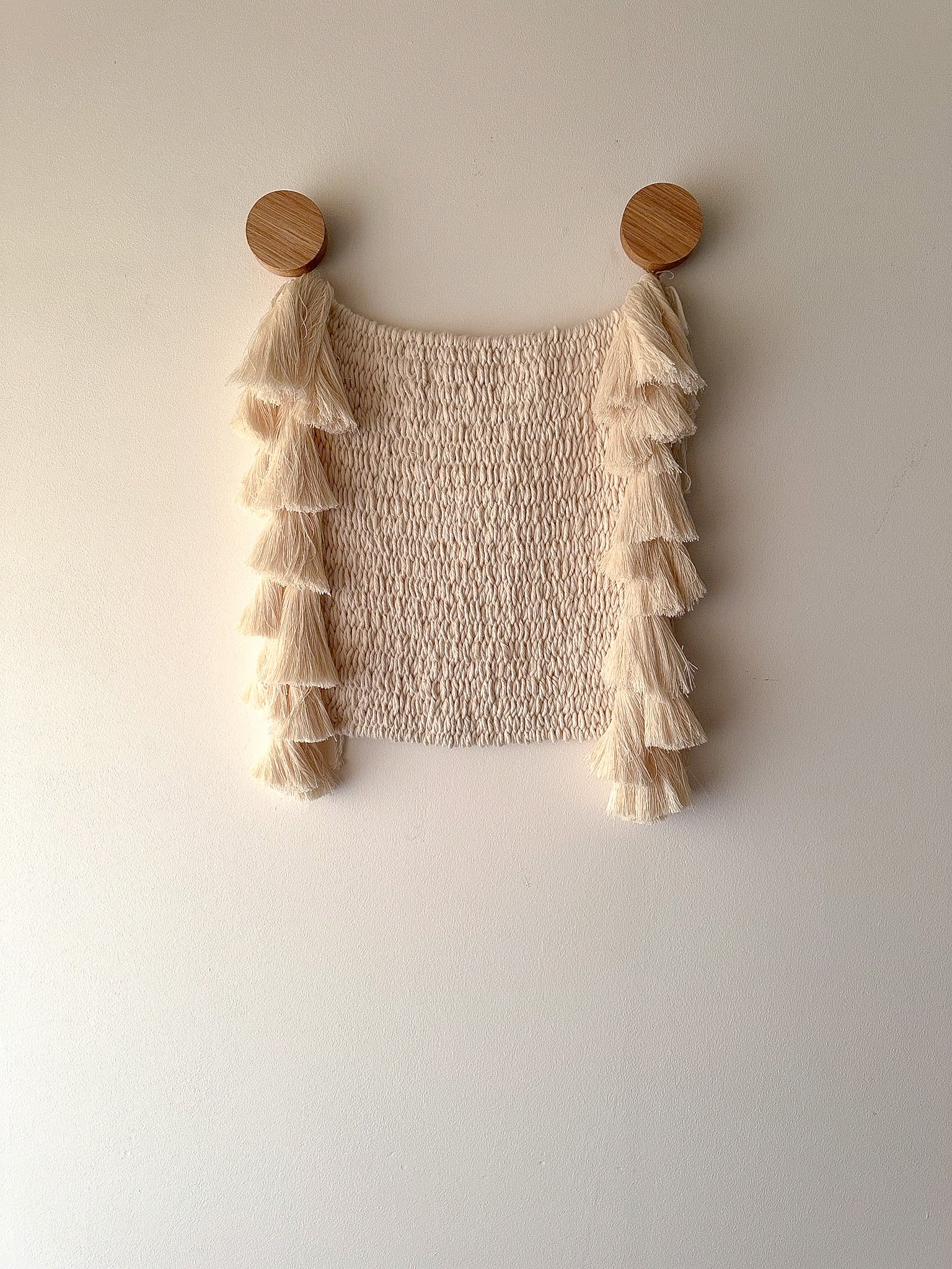 Handwoven in 1 mm natural cotton, Ilana explores softness through contrast — a minimal, textured panel framed by generous side fringes in 12 mm cotton. Suspended from its top corners on round oak hooks crafted in-house, the piece arches gently across the top edge, adding a sense of fluidity and softness.