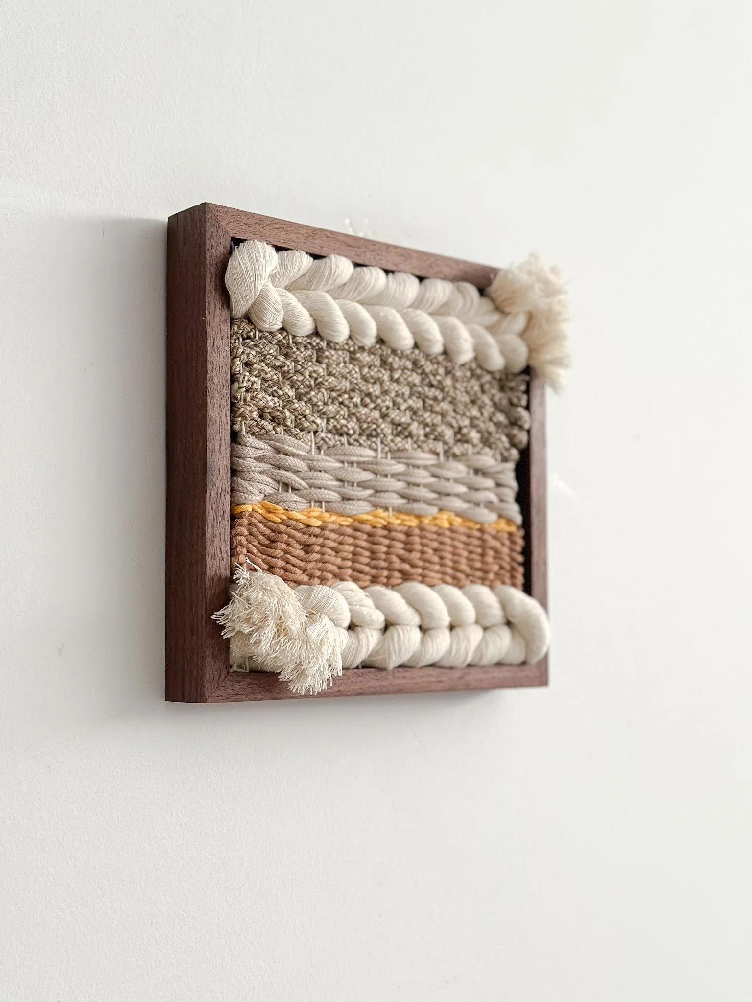 Because the frame is integrated, the work is structurally complete and ready for exhibition the moment the weaving is finished.